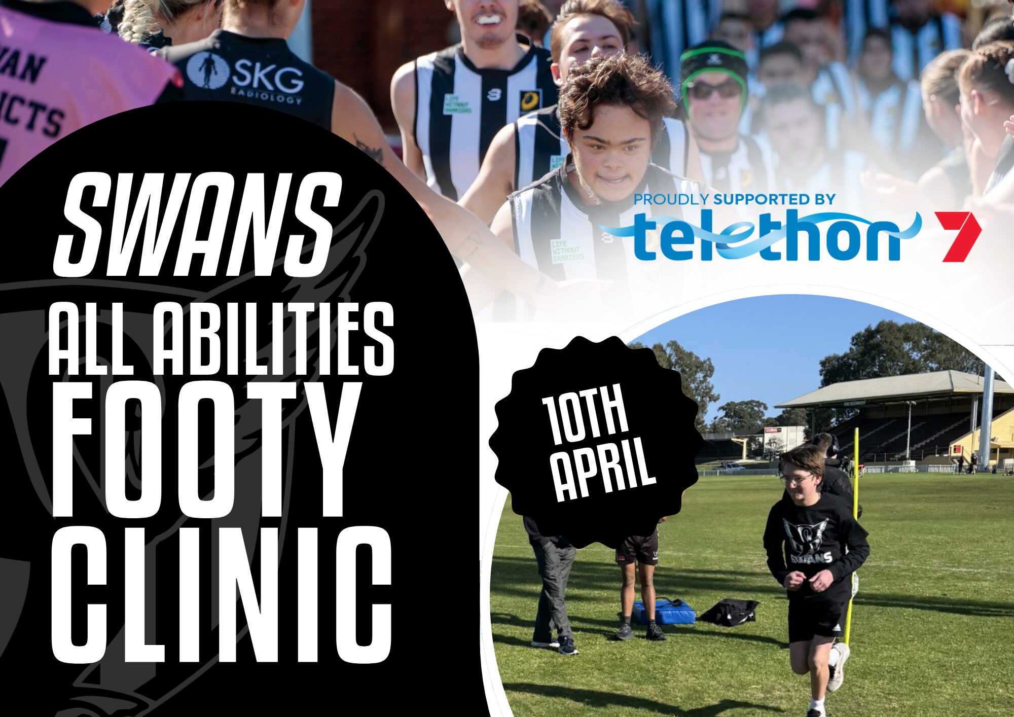 Swans are inviting boys and girls aged 5-17 living with disability to join the fun at our All Abilities Footy Clinic on Friday 10 April at Steel Blue Oval in Bassendean, running from 10am to 12:00pm.